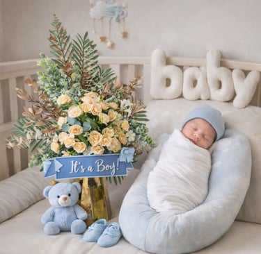 احتفل بقدوم المولود الجديد مع باقات ورد ناعمة بتنسيقات طفولية مميزة للأولاد والبنات، مع إمكانية إضافة شوكليت فاخرة، بالونات، أو دمية أنيقة تضيف لمسة فرح لا تُنسى.